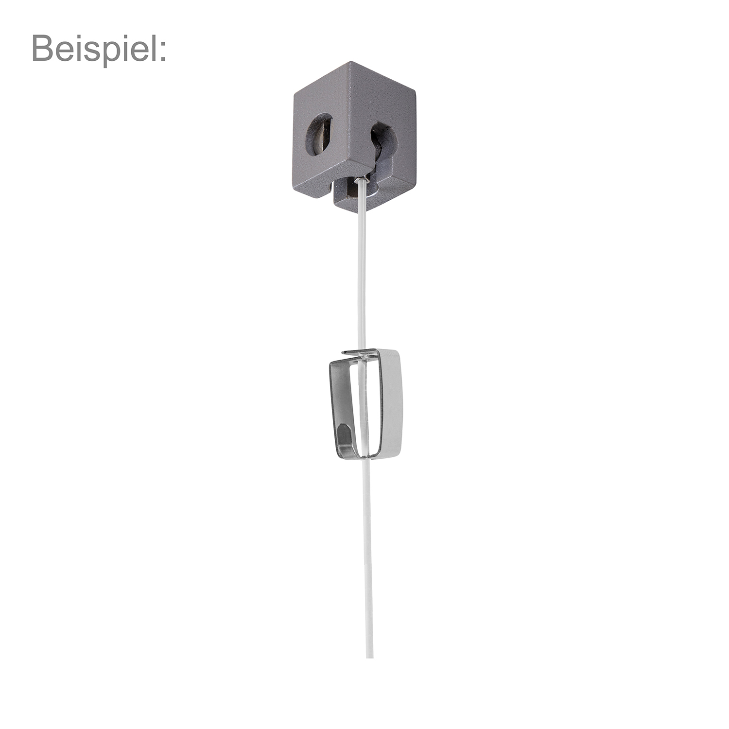 Für den qubic-Solohänger wird zusätzlich ein Seil mit Softgleiter (Perlon- oder Stahlseil in verschiedenen Längen) sowie ein Bilderhaken benötigt.